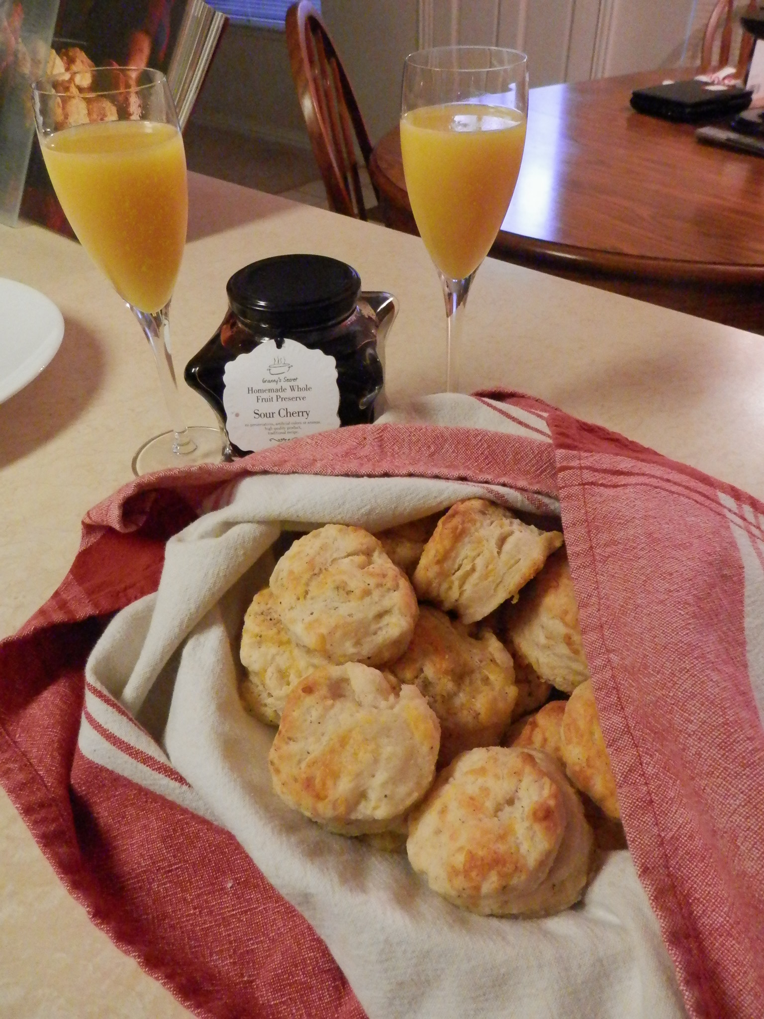 The biscuits were paired with the most wonderful whole sour cherry preserves on the planet. The label says they were imported from Serbia. Actually we purchased the preserves from a specialty store just because the jar was so darn beautiful. Turned out what is in the inside of the jar is just as awesome. Close your eyes and picture pitted sweet cherries swimming around in a pool of the richest, darkest cherry juices. I know … made me tear up also.