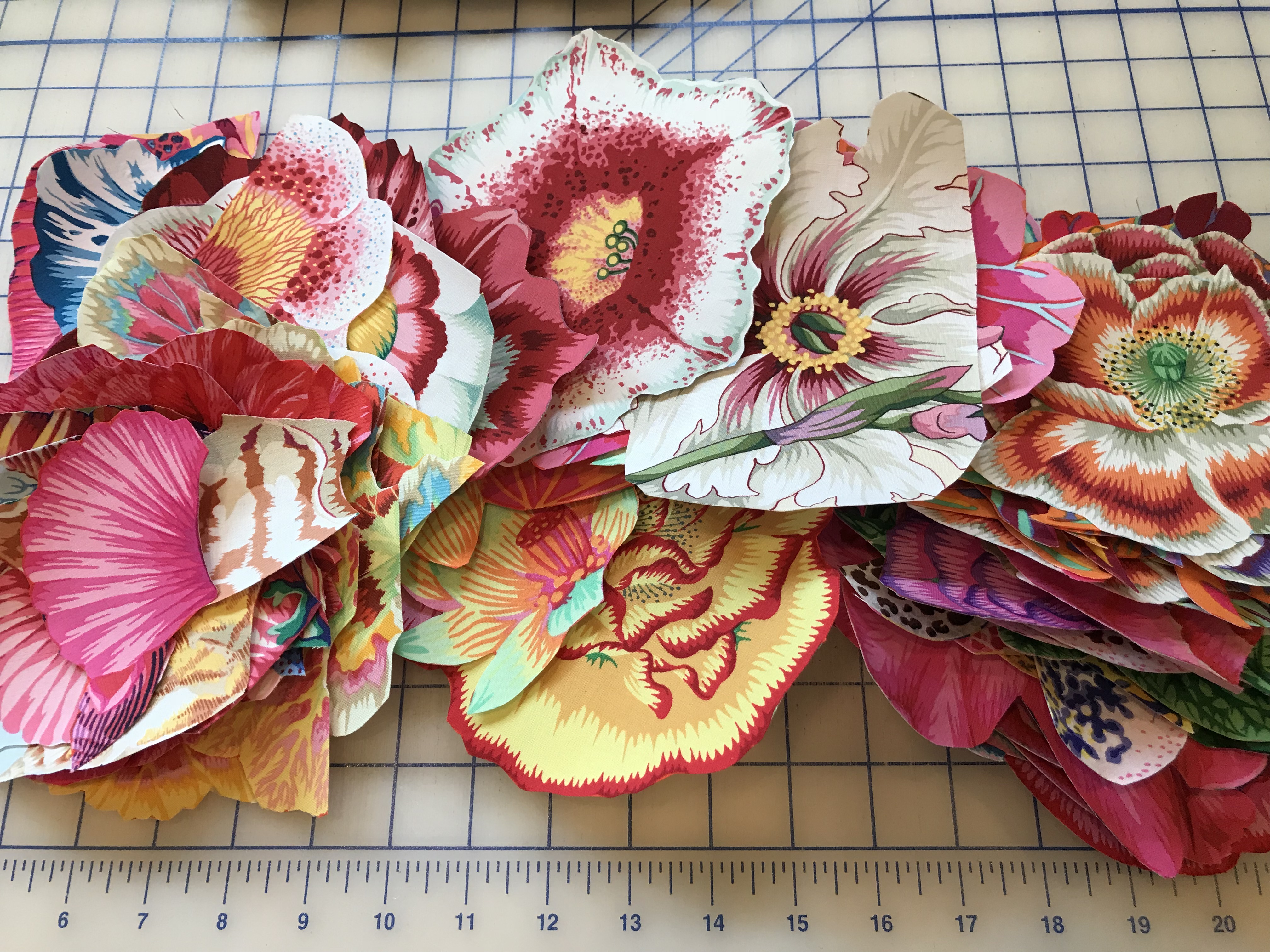 • Once you have the pattern outline transferred to the pattern ease, all the fabric pieces are fused onto the pattern ease background. I only use glue after all the pieces are fused. After cutting out the image, I glue the outside edges of the fused image onto the background fabric. For each pattern I have created, I give lots of detailed tips on who to collage and finish the project. It is so fun! You will love it! The only sewing involved is quilting the three layers together and I have a longarm lady do that for me.