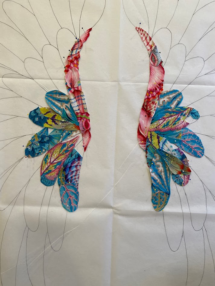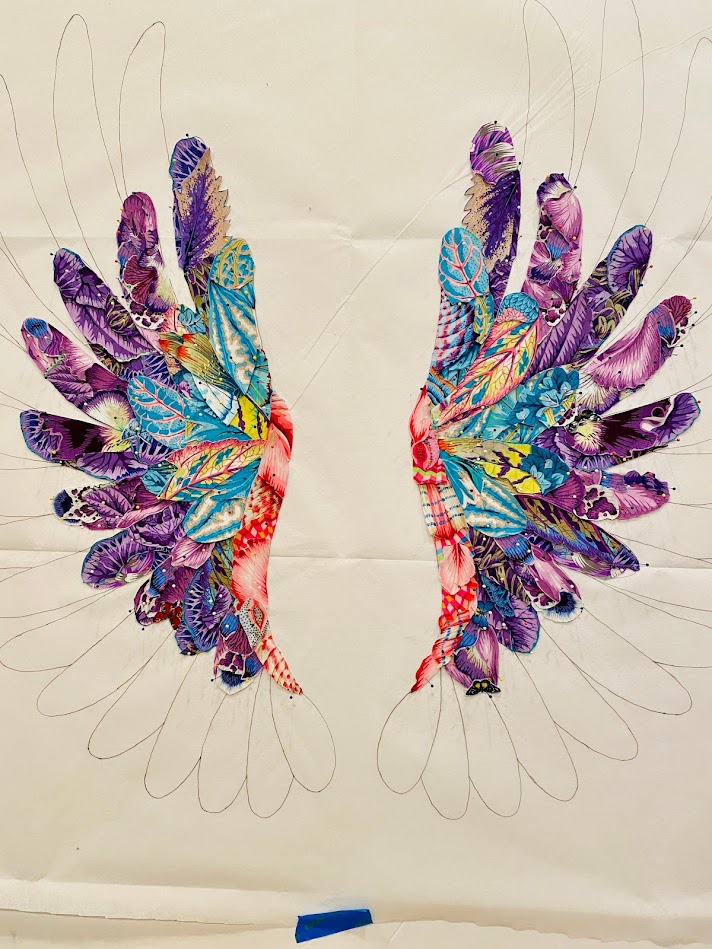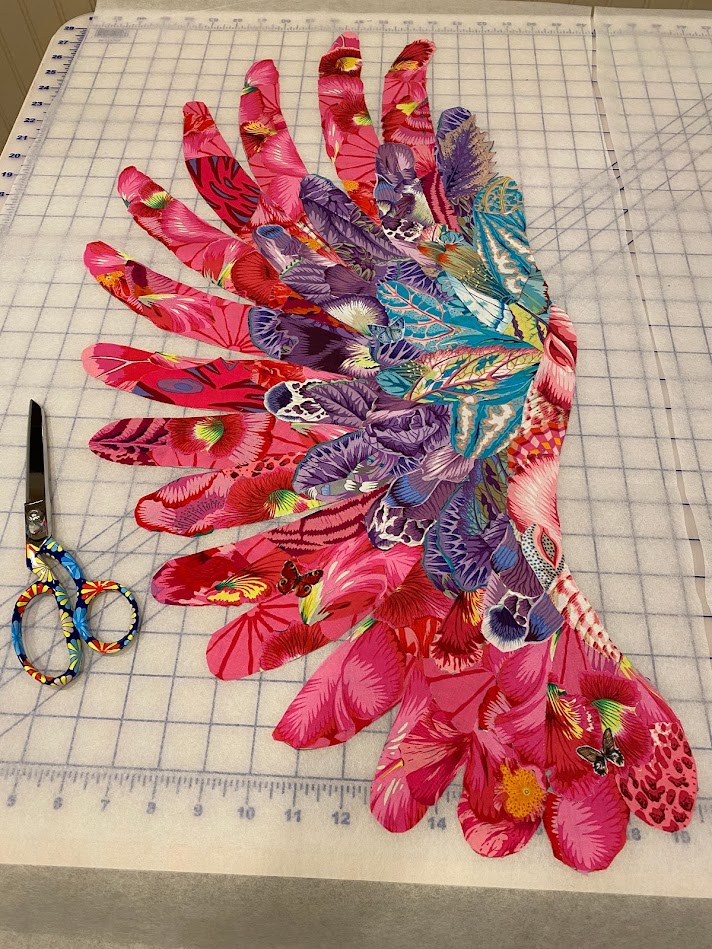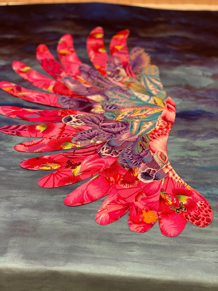 The Father Christmas image measures 22″wide by 33″high. When the collage is completed, glued onto the background fabric, and quilted, Santa is meant to be an art quilt. I have several art quilts I hang seasonally around my house. This Christmas, Santa will be hung in the foyer! Once completed, the final quilt measures 37″ wide by 46″ high. My longarm quilter used metallic thread to custom quilt Father Christmas. Not all the fabric used was Christmas-themed. Notice the peacock fabric used for Santa’s eyes. The background longarm quilting is an all-over pattern with swirls and snowflakes. I just love how it turned out! Below are photos from making Father Christmas.