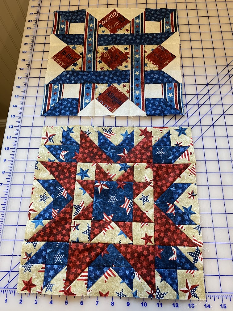 I purchased the quilt kit at Stitchin’ Heaven in Quitman, Texas a couple of years ago. After the quilt top was finished, I purchased a wide back quilt backing with a patriotic-theme from My Favorite Quilt Store. The kit sat on my project shelf for a year after reading through the instructions. I noted the kit could be made with, or without, the central panel with the eagle. The instructions stated the quilt could be made with six-pieced blocks and the panel, or twelve pieced blocks with no panel. After finally piecing one of the blocks, I decided the quilt would be made with the panel. The pieced blocks were very challenging. There were lots of biased pieces. Six blocks vs. 12? Easy decision on my part! I almost had to go to confession over a few of them.