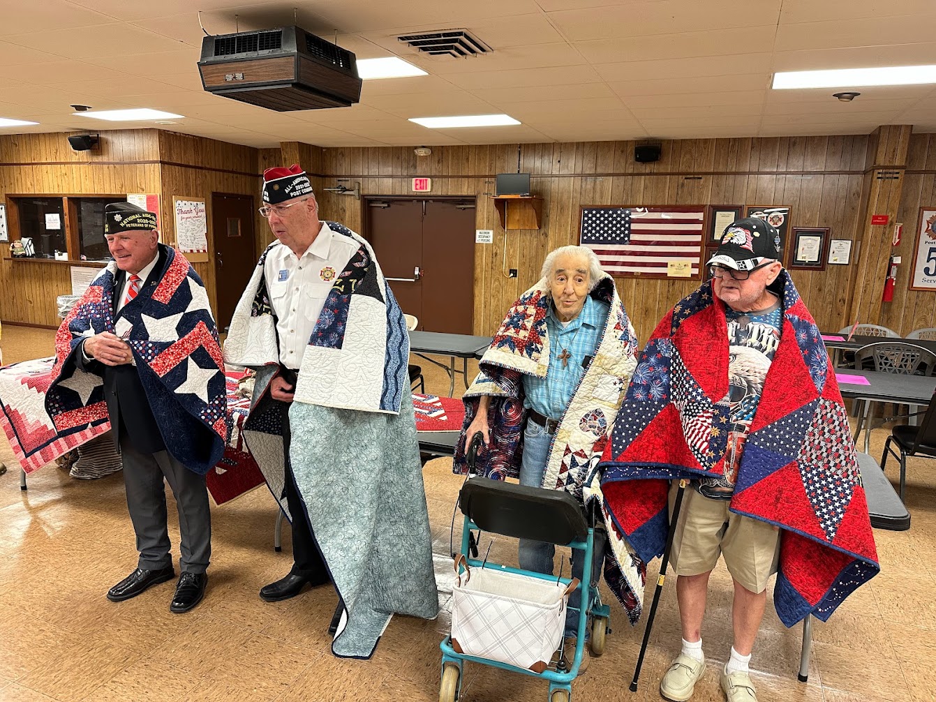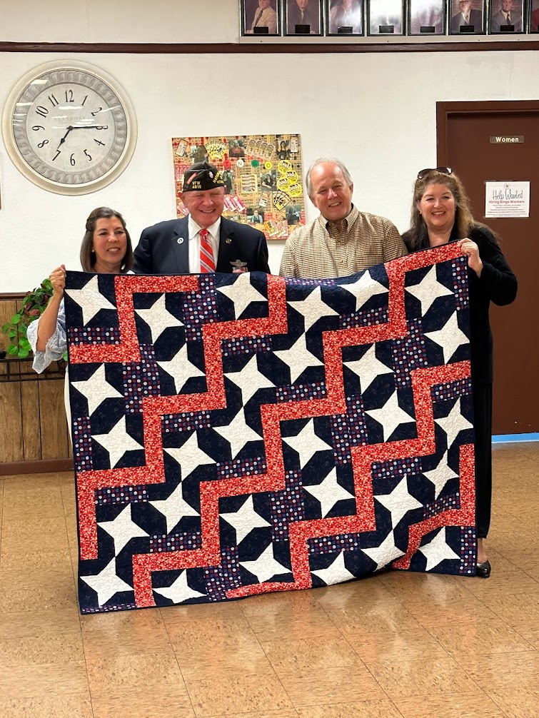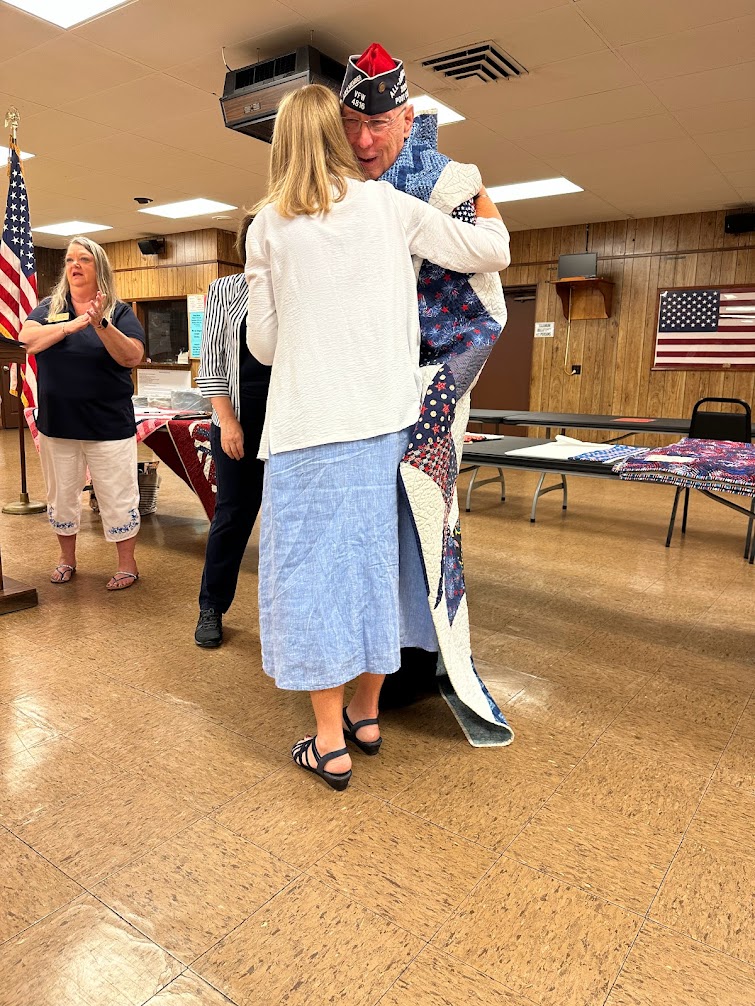 Quilt of Valor is a national organization that has given veterans quilts since, I believe, right around 2004. As of July 31, 2023, 354,712 quilts have been wrapped around the shoulders of service members and veterans. The mission of Quilts of Valor Foundation is to cover service members and veterans touched by war with comfort and healing quilts. Not only are the quilts wrapped around the shoulders of recipients like a “hug” during the ceremony, we also give them a little hug!